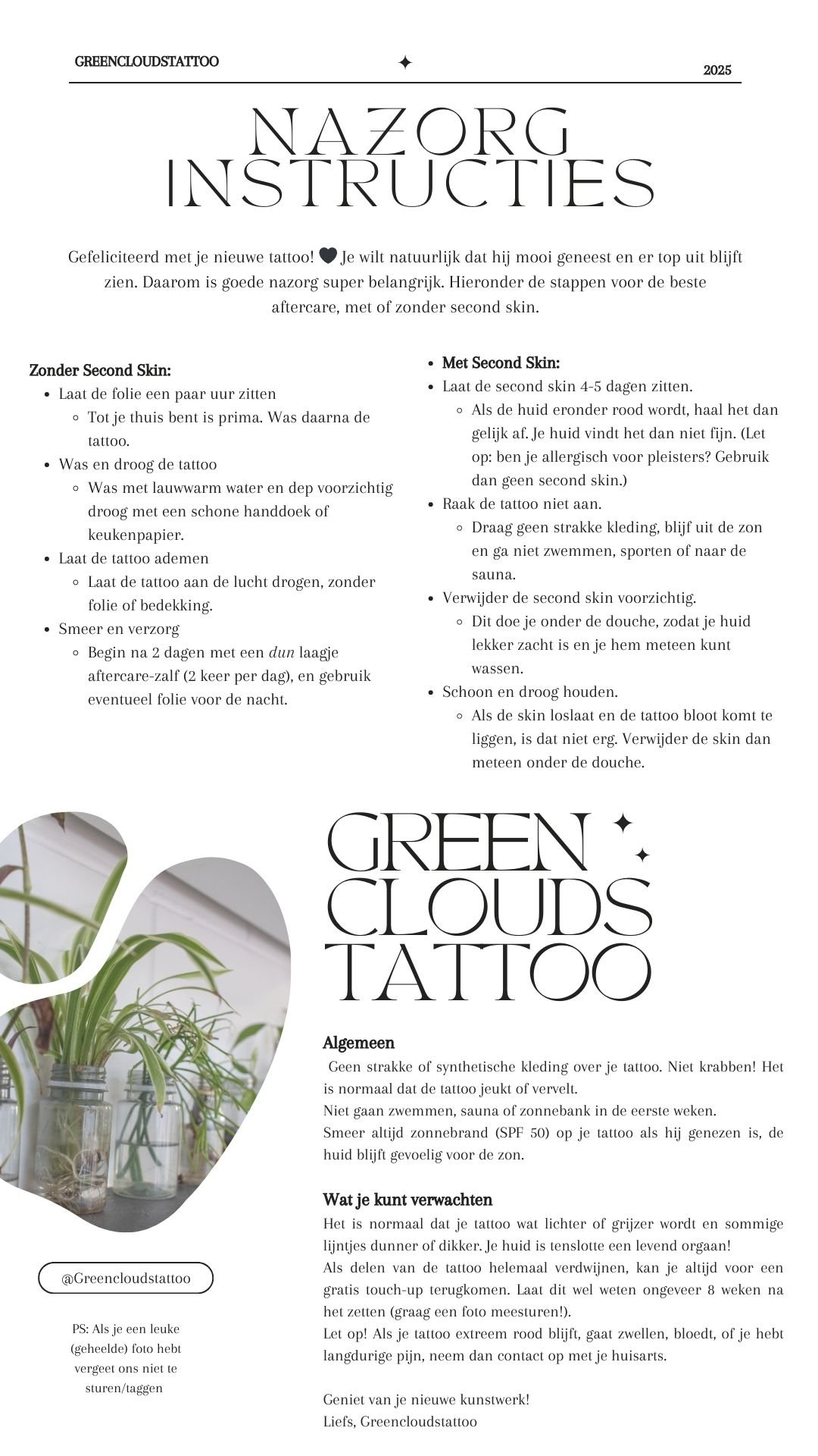 Wanneer je net uit de stoel van de tattoo-artiest komt, is het belangrijk om voorzichtig te zijn. Meestal krijg je een stukje folie of een 'second skin' (een soort beschermende film) over je tattoo. Hoe je deze verzorgt, hangt af van wat je tattoo-artist je heeft meegegeven.
